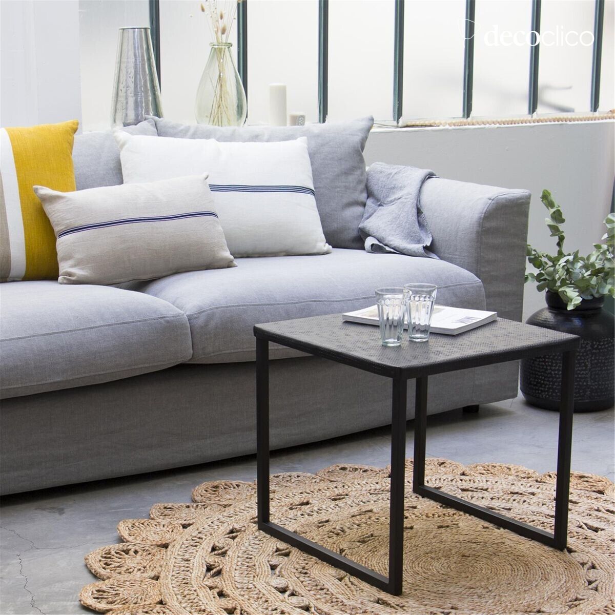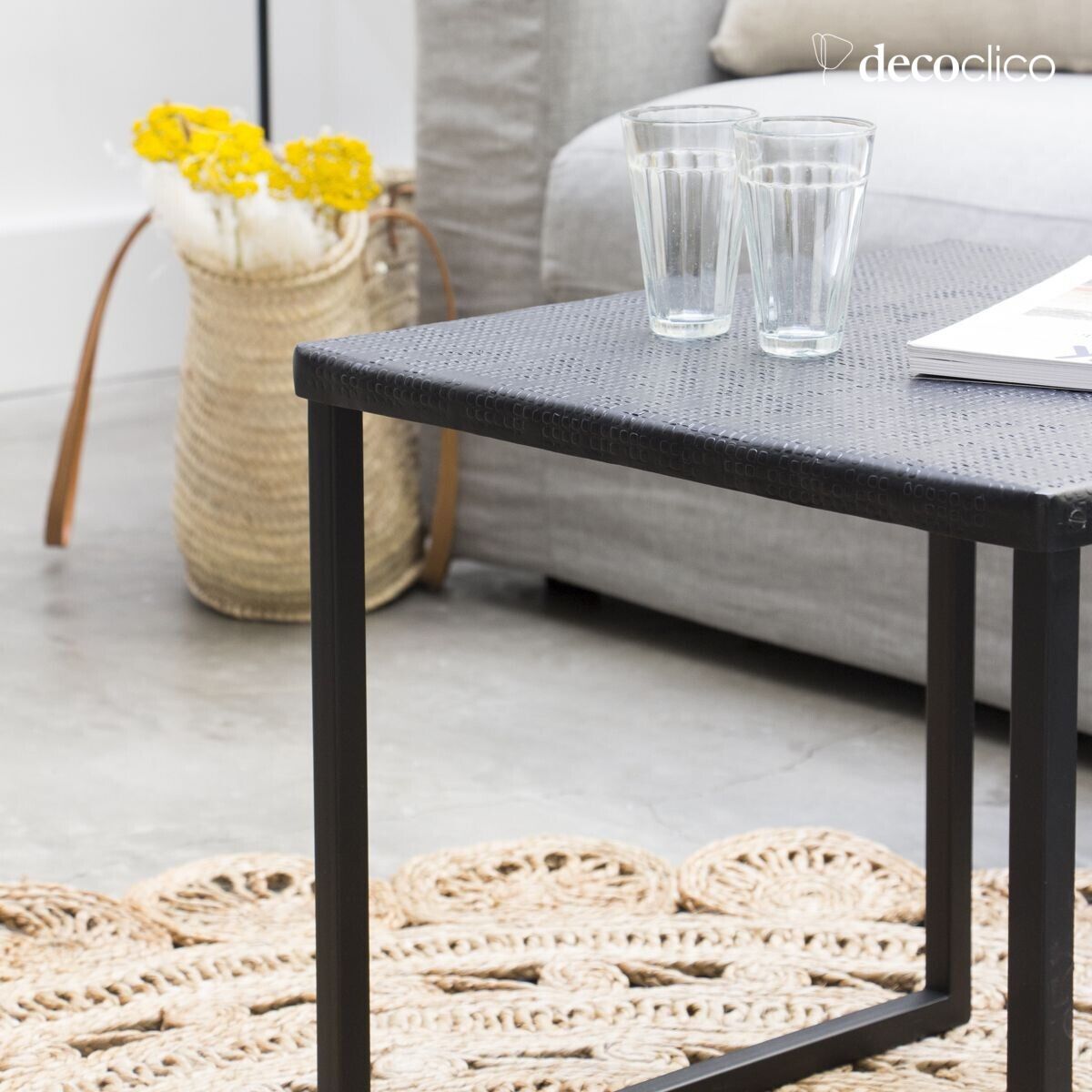 Mesa auxiliar cuadrada de metal negro mate, muy robusta, realzada con una tapa de metal grabado. Una mesa a la vez moderna con un toque de tradición, de hecho su tapa texturizada está adornada con grabados hechos a mano, nos gusta la combinación de un producto depurado con este toque de originalidad. Como mesa auxiliar entre dos sofás, como pequeña mesa de centro con estilo en un espacio reducido o como mesita de noche a ambos lados de la cama, esta original mesita aportará un toque decorativo muy bonito a su hogar. Descubra toda la colección Trévor