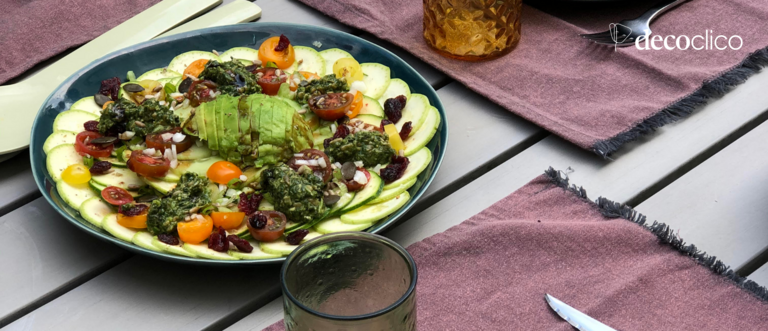 Une recette, une assiette Clélia by @daliaandrose offers you a recipe for zucchini carpaccio with pesto, in perfect harmony with the plate from the lagune collection . Hand-finished ceramic tableware made in Portugal by Decoclico.